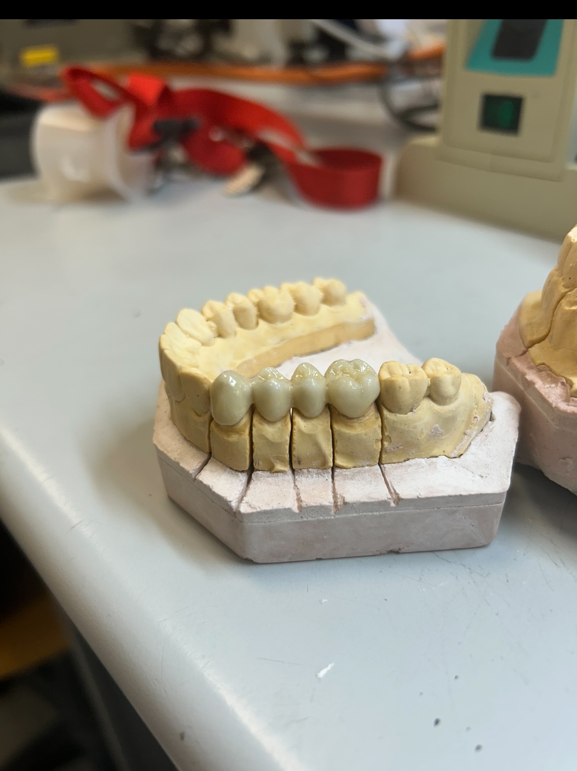 - Cada vez que apliquemos una capa de cerámica lo meteremos al horno con su correspondiente programa, teniendo en cuenta el tipo de cerámica que hemos utilizado y las cocciones. En los puentes es muy importante separar mediante un bisturí los puntos de contacto entre pieza y pieza antes de meter en el horno