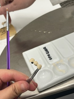 - Lo siguiente, será aplicar la cerámica, comenzaremos con la dentina, con el pincel y un poco de agua para limpiarlo, le daremos el volumen y la anatomía deseada poco a poco. Es muy importante coger la pieza con las pinzas de mosquito ya que la grasa de nuestras manos puede dañar la cerámica.