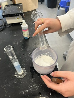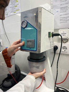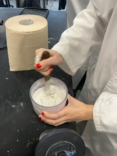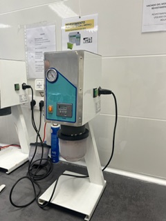 - Seguidamente, preparamos la mezcla del revestimiento, siguiendo las medidas del fabricante, en primer lugar lo mezclaremos a mano durante unos segundos y después utilizaremos la espatuladora al vacío. Una vez espatulado, colocamos el cilindro en la vibradora y vaciamos la mezcla en el con cuidado.